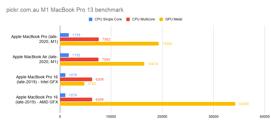 On a benchmark level, the performance begins to be seriously noticeable when you compare Apple M1 laptops versus some of the Intel models in the list, with solid performance in the 13 inch beating the 16 inch MacBook Pro with an Intel Core i9 in both CPU and GPU performance, but coming in under where the AMD graphics loads for the discrete graphics chip.