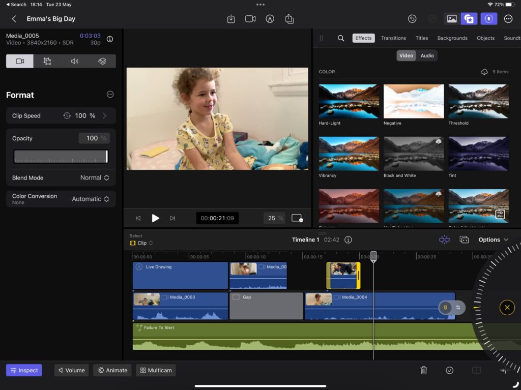 We tested FCP on the iPad with both the M1 iPad Air and the M2 iPad Pro for this review, and found little in the way of major differences, beyond how the cameras handled and the size of the screen. Clearly, the bigger and better the iPad that you have, the more capability you have. That’s not exactly rocket science.