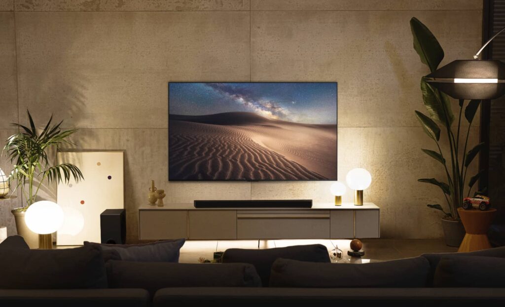 Another big soundbar, Samsung’s Q990B goes a little beyond the others with a total 11 speakers for the surround, one subwoofer, and then four up firing speakers, creating a massive 11.1.4 sound for an entertainment space, all from four components: a big soundbar, a subwoofer, and two rear speakers.