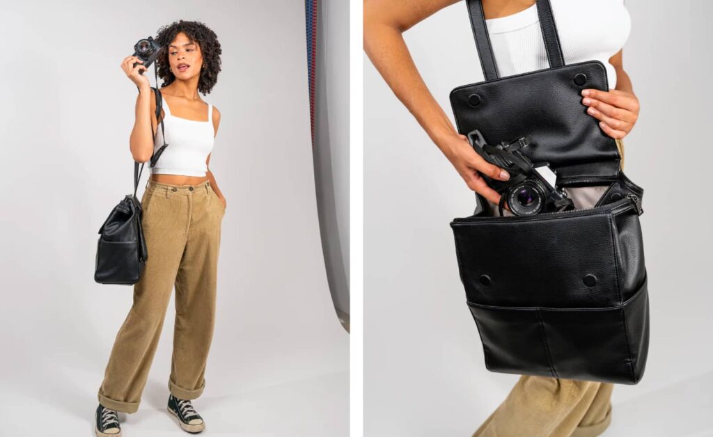 These points of difference gave birth to a style of camera bag that appears different, and less like the traditional camera bag. The outside relies on vegan leather which is lighter than real leather and comes with the benefit of not harming animals, while the inside is padded to keep camera gear well protected.