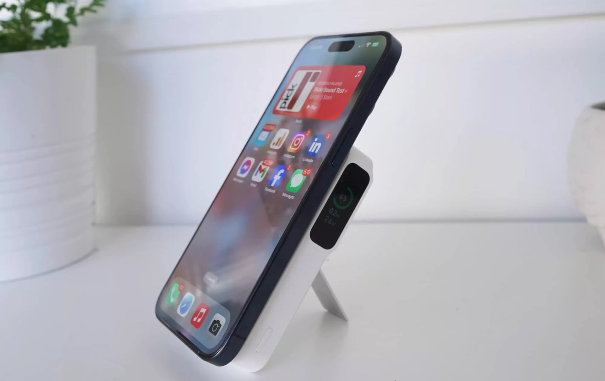 Flip the stand out the back and attach an iPhone magnetically, and all of a sudden, you have little screen that’ll stand up all by itself while being charged. It’s handy, for sure.