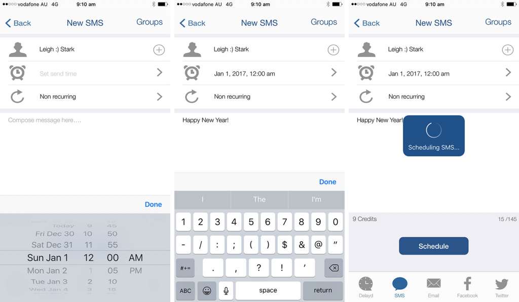 After spending time with a few of these, the best we’ve found is “Delayd”, a scheduling app that works on the iPhone for more than just texts, but requires you to buy credits if you want to send texts. You get ten (10) to start with, so that might be enough to start you off if you’re only planning on sending messages to up to ten friends, but if you want more people to get your message, you need to spend something on an in-app purchase.