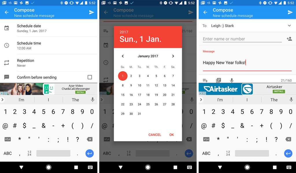 SMS Scheduler does come with an ad or two that sits above the keyboard limiting screen real estate, though it can be removed for two bucks. Mind you, if you can live with an ad for the one New Year’s message and then decide to get rid of the app post NYE, say on New Year’s Day, we wouldn’t blame you, though using an SMS scheduler could just change the way you talk to people, especially if you’re trying to, stagger, your conversations.