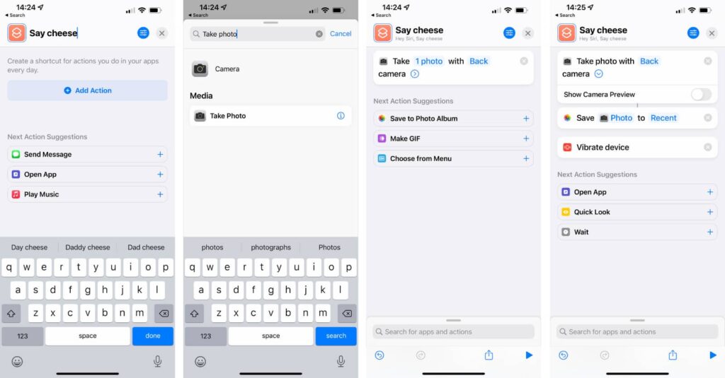 For this custom selfie command, we’re actually going to name it “Say Cheese”, which automatically adds that as a command to Siri. You’ll be able to say “Hey Siri, say cheese”, and it will do the commands you trigger in the order you want.