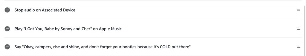 You might note that we’re pretty specific in our routines, and that’s because you’re ordering your smart speaker what to do. Set the volume, say something, set the volume again to account for music loudness, and then when you’re done, maybe say something again.