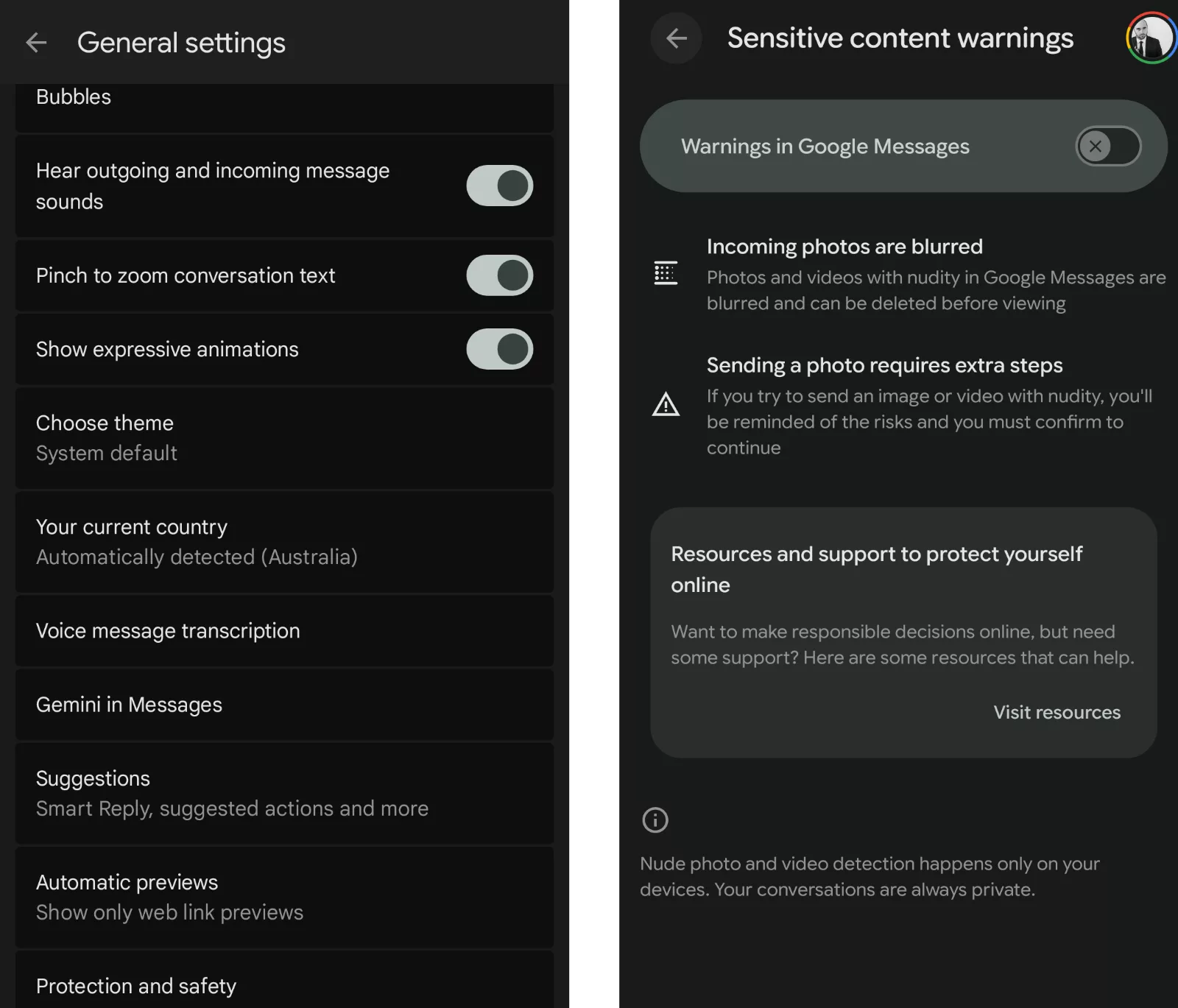 From there, you can click into “sensitive content warnings” to automatically blur an image or video, with automatic detection happening like the iPhone and only on your device.