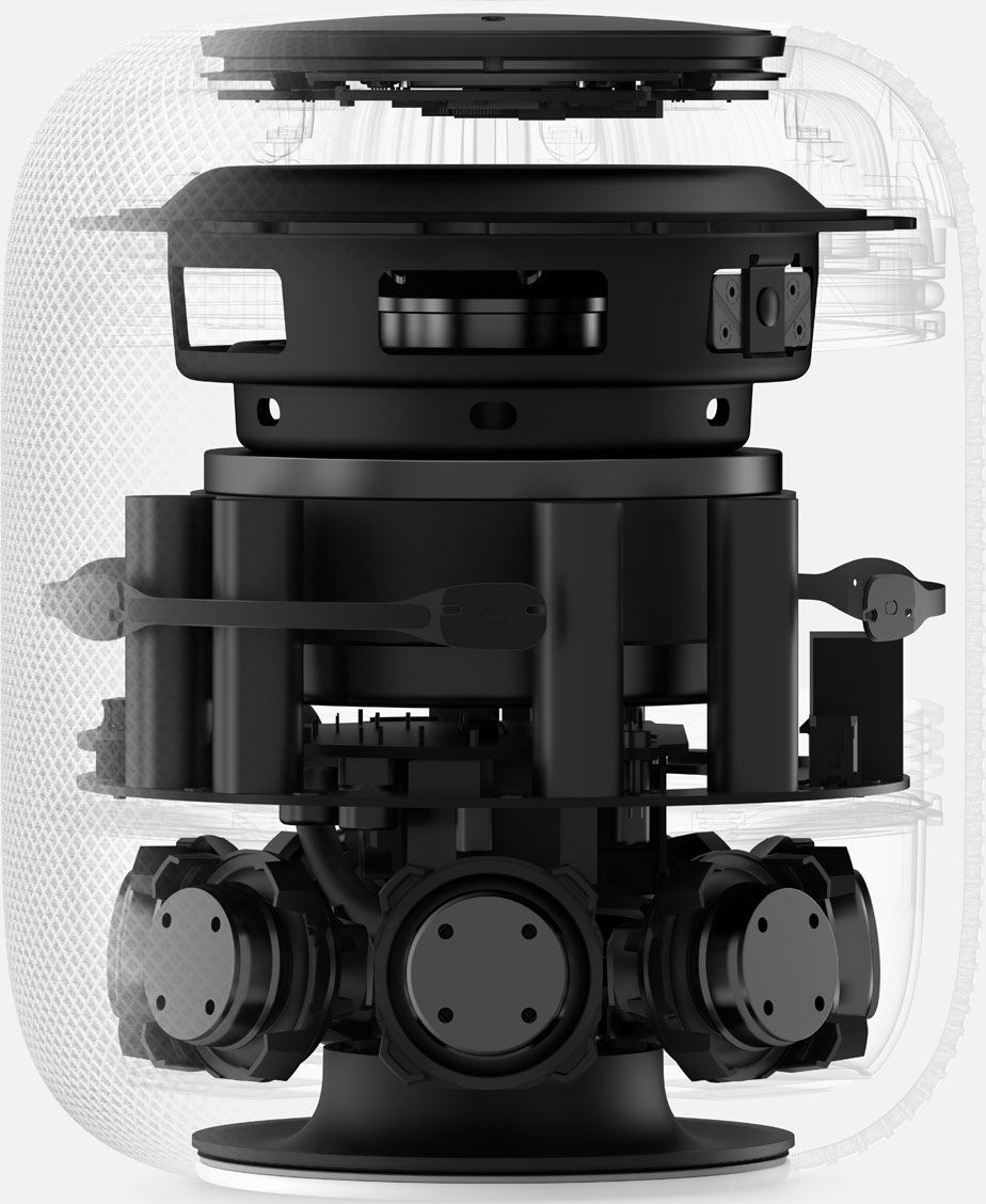 The powerful speaker technology Schiller speaks of is specifically found in the form of seven beam-forming tweeters each with its own amplifier, as well as an upward-facing woofer, and when paired with Apple’s A8 processor — which can be found inside the speaker and controls the technology inside — apparently provides deep bass and directional audio.