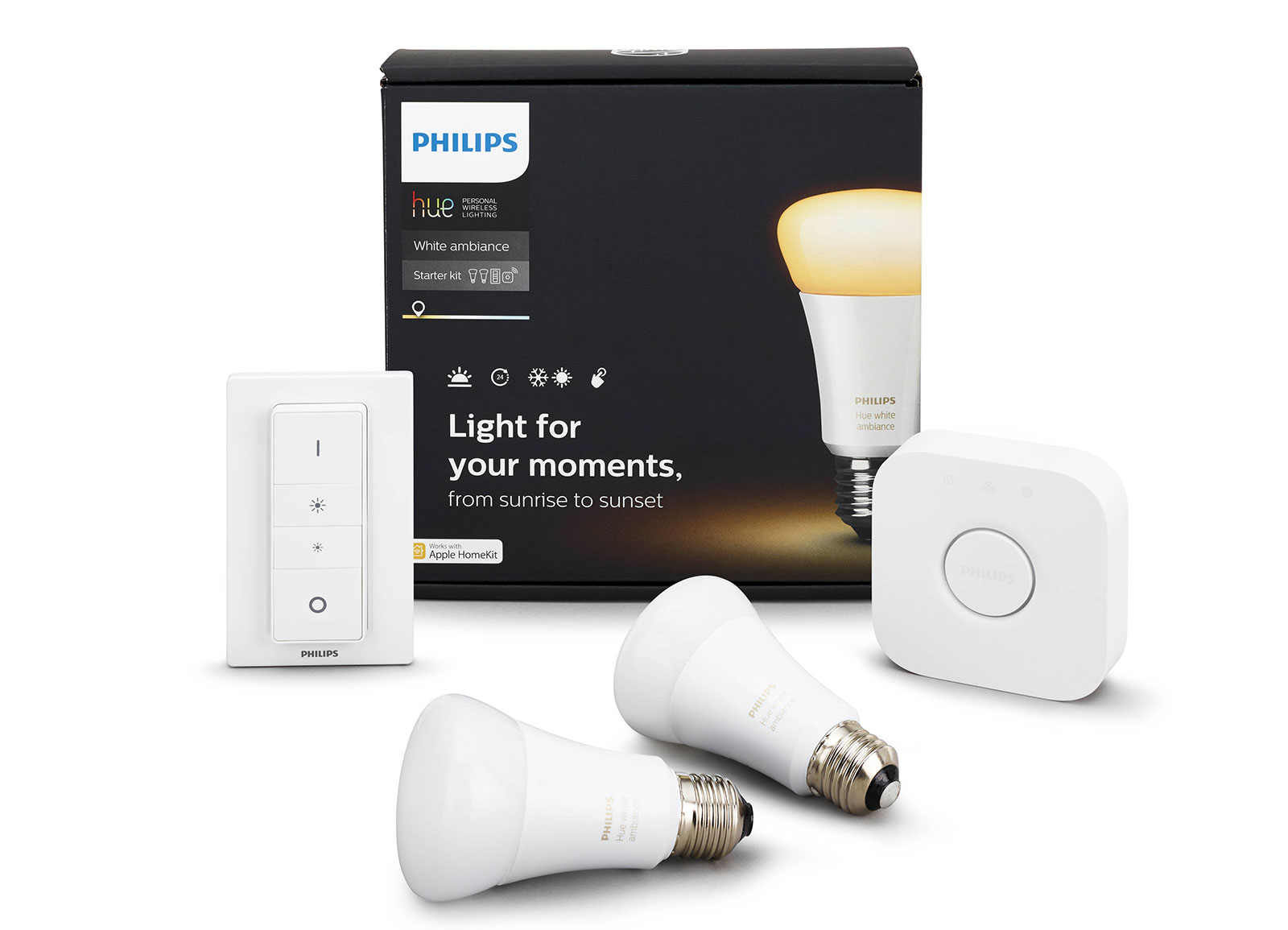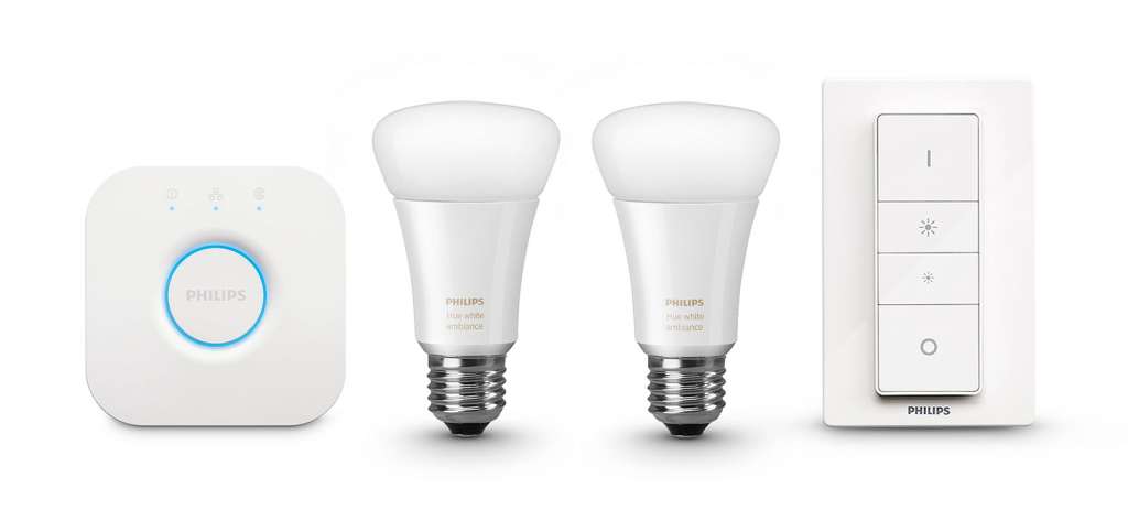 That means the starting price is easier, dropping to $190 for two Philips Hue Ambiance light bulbs, the necessary base station, and a remote control dimmer that can be wall mounted, working with more devices, including an Apple Watch and Apple’s HomeKit, not to mention Android phones and tablets, too.
