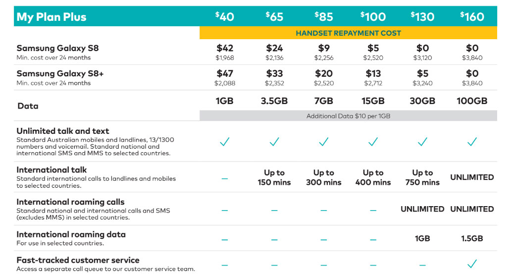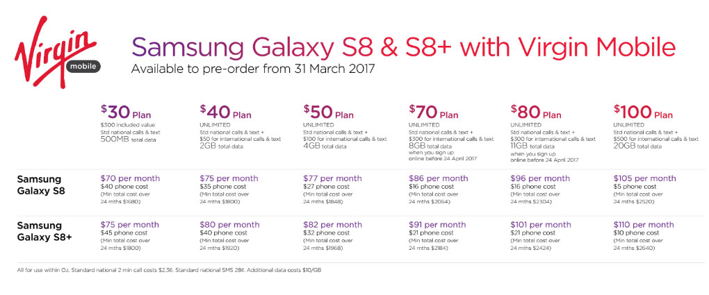 As a heads up, every one of these plans includes a handset repayment cost over the 24 months the plans stretch for, so even if you land the $30 plan, you’ll find a $40 or $45 monthly handset repayment for the S8 and S8+ respectively.