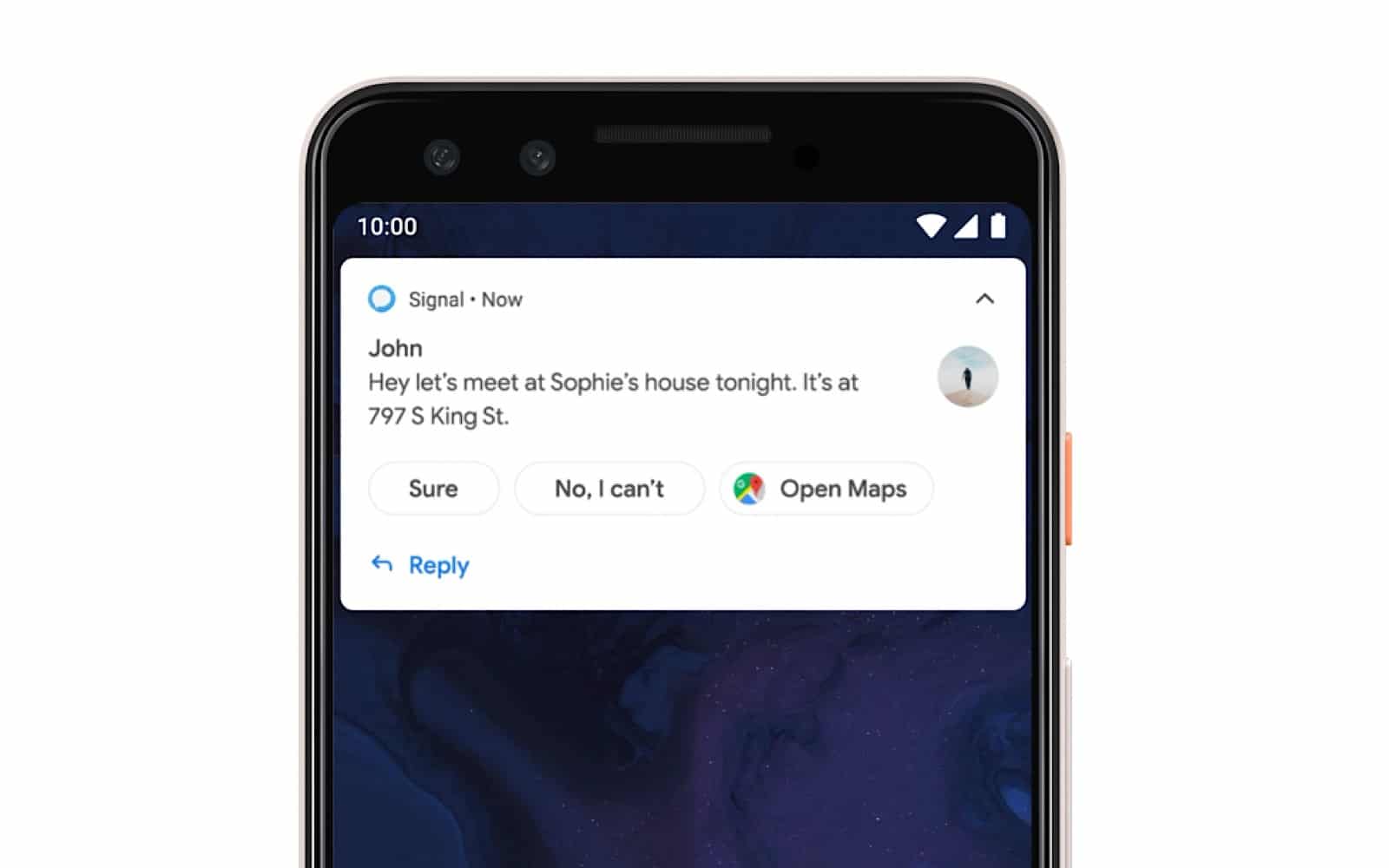 In Android Q, Smart Reply aims to predict your next course of action, such as giving you suggestions to reply to messages with, or to know what to do with an address someone sends you, and open it directly in Maps.