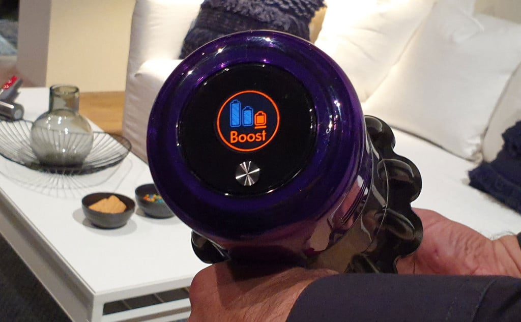 While it won’t detect what type of dust or particle is being sucked and alternate the power based on that — we asked, Dyson said it’s not possible yet — it will account for floor type, and shift the power and battery time to consider that.