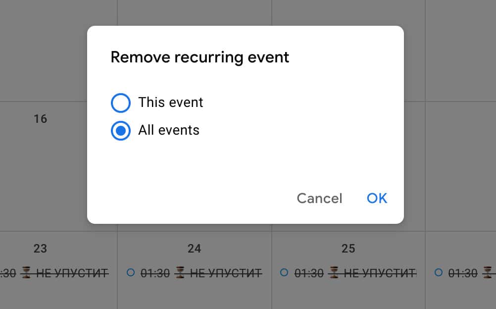 It means if you’re unlucky enough to be invited to a nonsense event by a scammer, you’re calendar will be populated with events every day for as much as two years, with each event including the same name, text, and location.