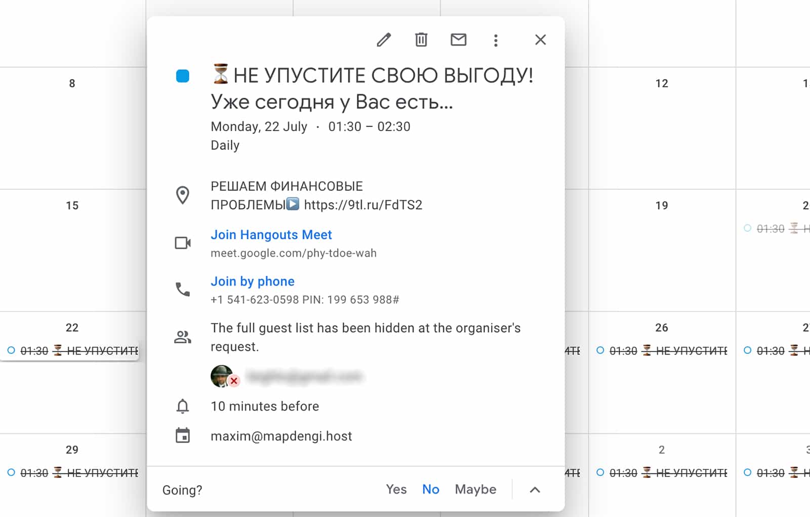 Scammers are able to get these calendar invites through underneath your mail client’s automatic measures, which is to say, Gmail and other mail systems tend to automatically throw calendar entry invites into the calendar even if they’re not something you want or care about.