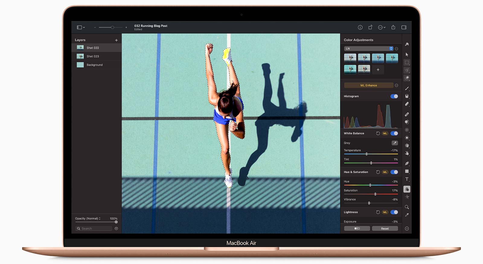 Apple is reporting nearly four times chip performance of previous Intel-based Air models, which were only updated this year. That results in improvements everywhere, boosting up to three times the performance in iMovie and up to five times in Final Cut Pro, while graphics-intensive games should be better on a machine not really considered for them. No fan is included in this design, either, so the Air can run silent and cool.