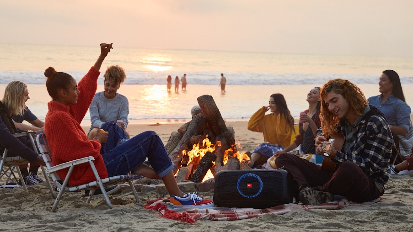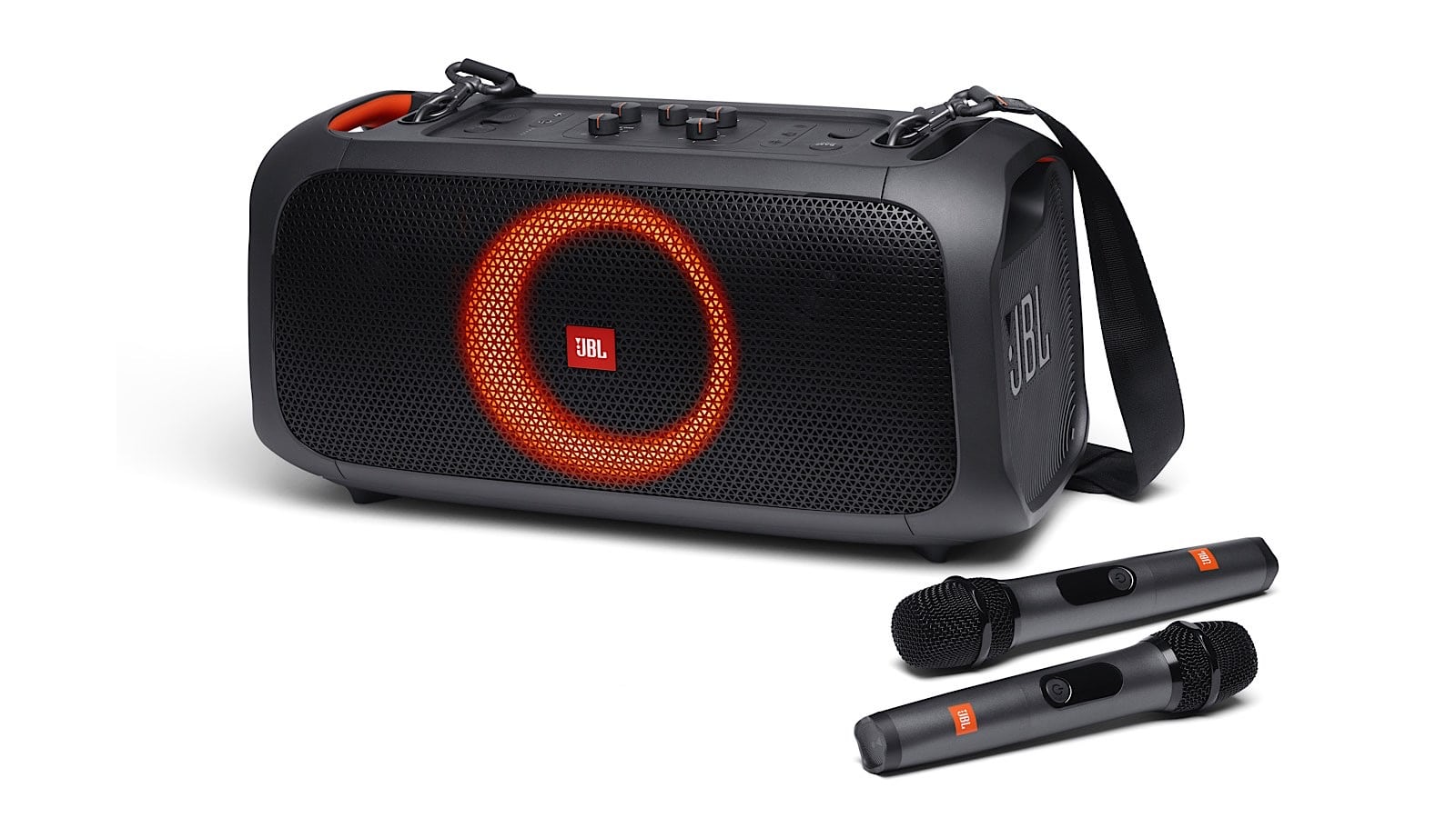 JBL’s take is the PartyBox On-The-Go, a IPX4 splash-resistant wireless and cordless speaker sporting a padded shoulder strap and 100 watts of power, complete with two wireless microphones to sing on top of the sound.