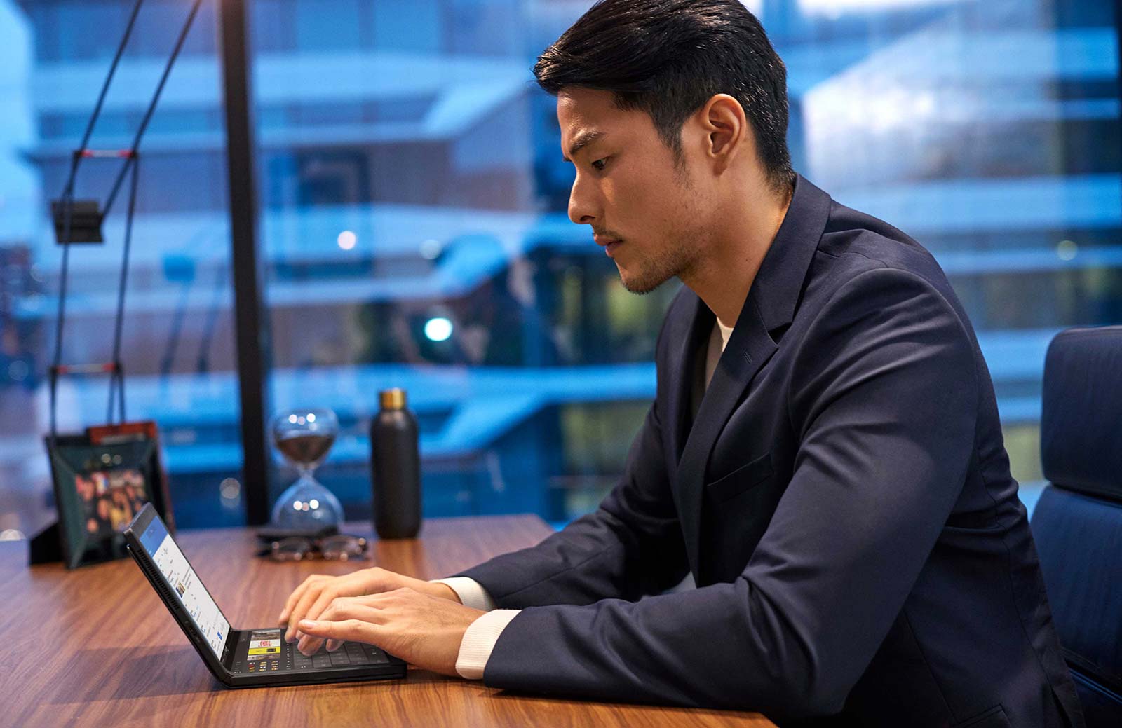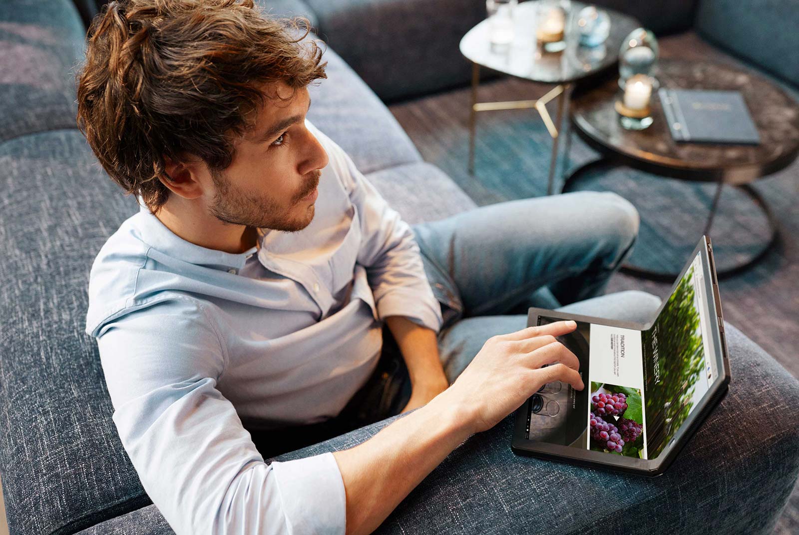 The folding hinge of the aptly named X1 Fold allows the computer to either be used as a 13 inch tablet, paired standing up with a keyboard on a desk, folded into two sections and used like a touchscreen book of sorts, or even turned into an even more portable notebook with a keyboard in the bottom section.