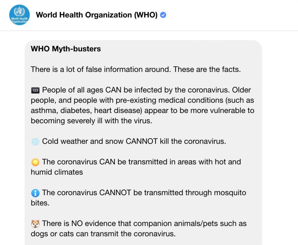 It’s available now, and you simply need to connect with the World Health Organisation on Facebook Messenger to begin.