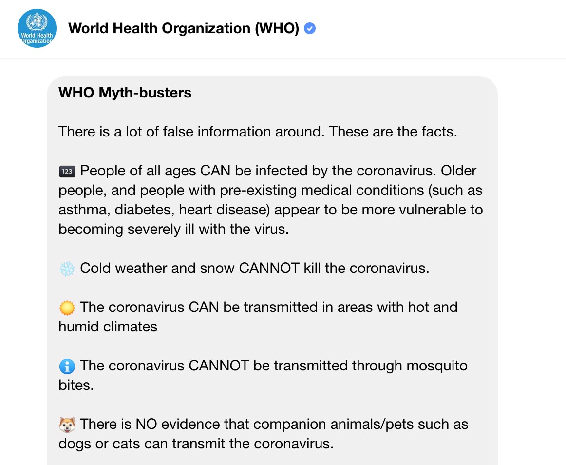 While it doesn’t link to one of the more useful database sources at the Johns Hopkins University of Medicine, the WHO’s Messenger system does provide information in a pinch simply by using a common messaging platform, and across numerous devices, pretty much across phone, tablet, and computer.