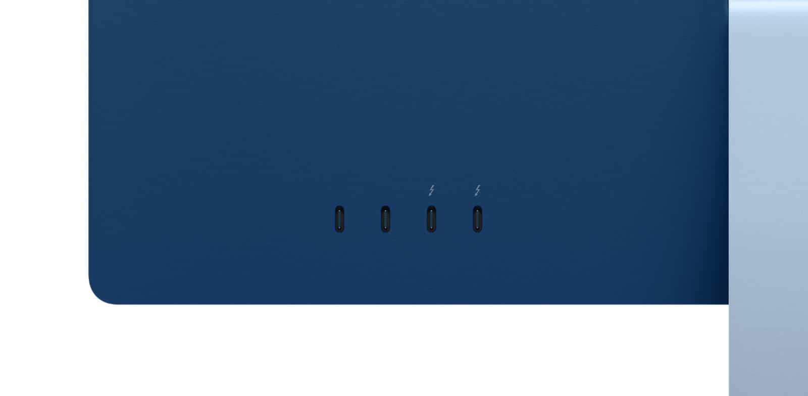 If you go for the low-end iMac, you’ll find two Thunderbolt 4 ports that also work as USB 4, and if you go for the other models, you’ll get those same two ports plus two other Type C ports that work for USB 3, plus a Gigabit Ethernet port, because some people still want hardwired networking in their computers.