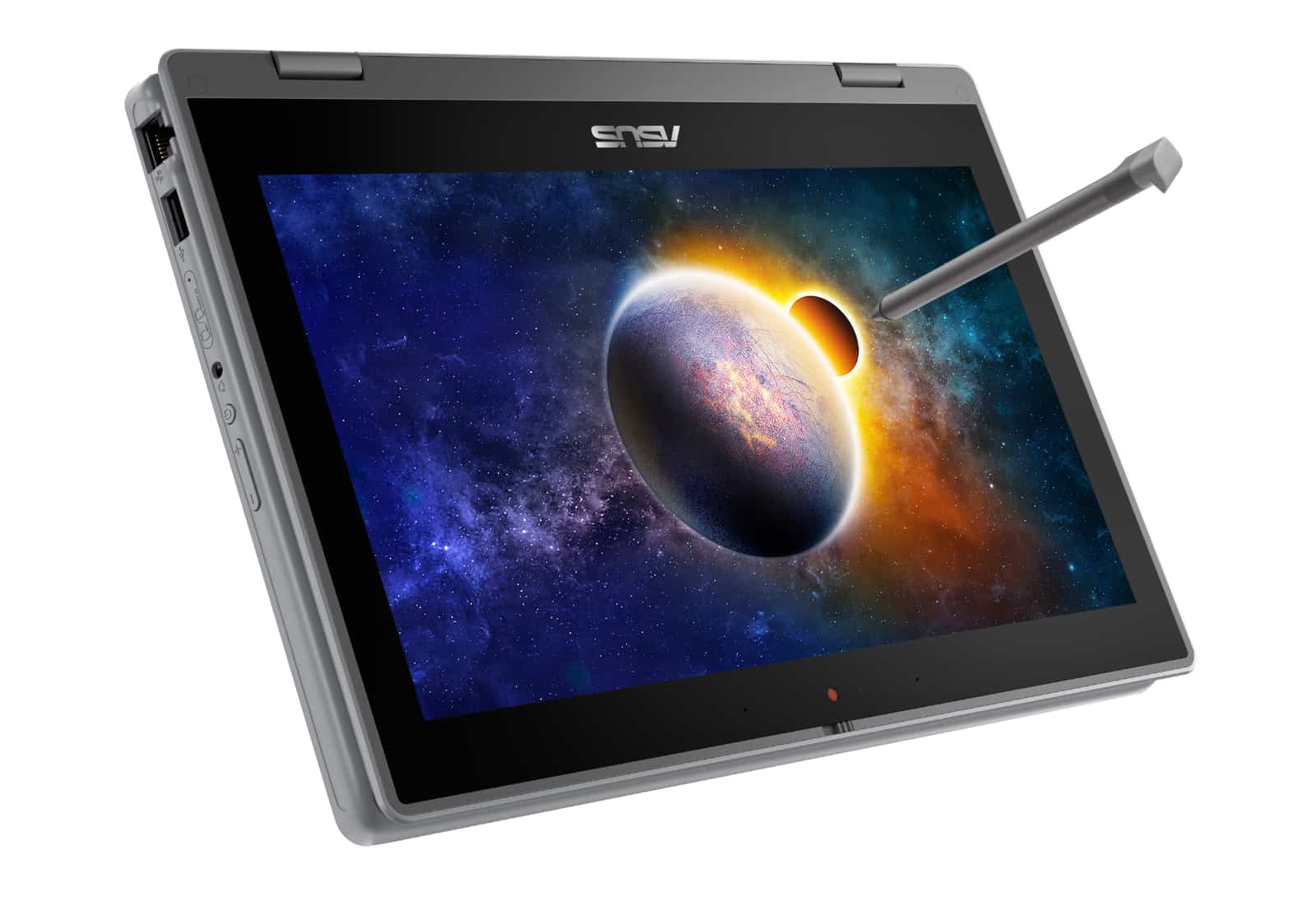 The Flip BR1100 isn’t a super fast computer, sporting relatively basic specs of either and Intel Celeron or a Pentium with 128GB storage, WiFi, Bluetooth, and USB ports, plus Windows 10 Home. There’s a relatively small 11.6 inch HD 1366×768 touchscreen, but that’s intentional, because this computer is focused on kids, and comes with a stylus to let them write and draw.