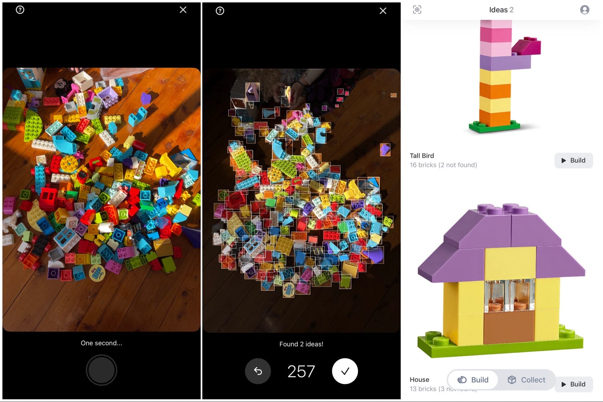 Basically, just do some quick work making sure Lego isn’t heaped on top of each other entirely, and the app will then snap your Lego collection, scanning the number of pieces, the type of pieces, and then working out what you can make with the pieces you have.