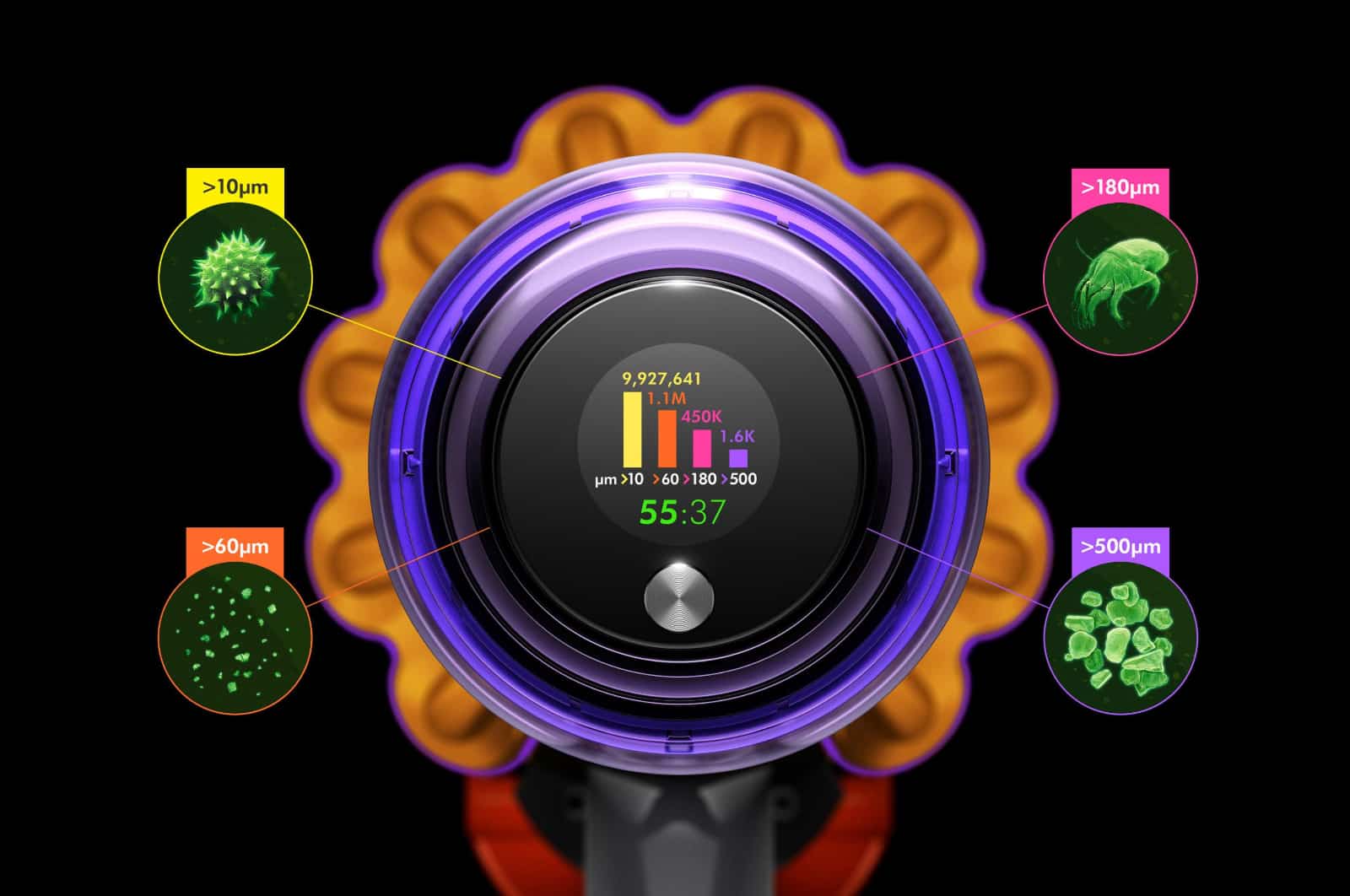 As Dyson vacuums now have LCD screens on the back (and have for a couple of years now), Dyson is using the information gleaned from that piezo sensor to tell you just how much dust you’re sucking up and at which sizes, complete with a readout at the back.