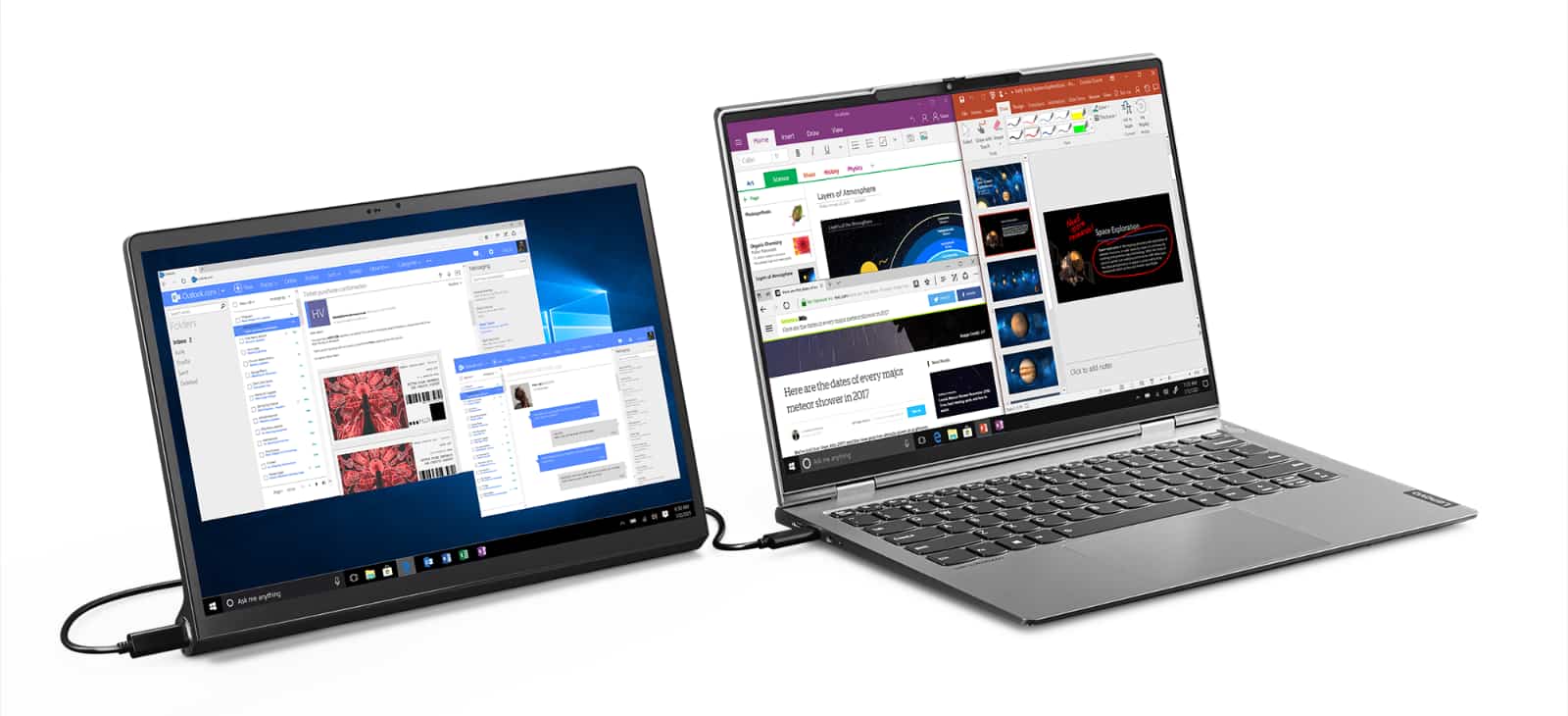 Both tablets are fairly large given the screen sizes, but the 13 inch Yoga Tab 13 offers a 2K display with up to 12 hours of battery life, while media is clearly the focus. There’s support for Dolby Vision HDR, four Dolby Atmos-capable JBL speakers, and it can even be used as a screen for a laptop, similar to Sidecar on a Mac, but with Windows and a cable.