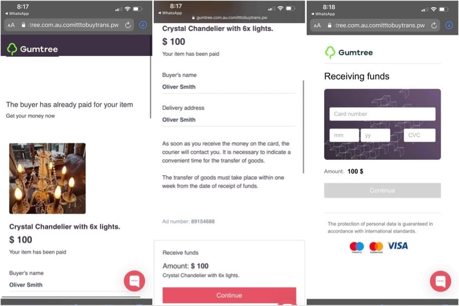 The approach is a little crazy, with a scammer contacting sellers through WhatsApp and advising that they’ve paid through Gumtree, but using a Gumtree sub domain through a different medium. From there, the site asks for the seller’s credit or debit card details, which will then reportedly send the payment back to the card.