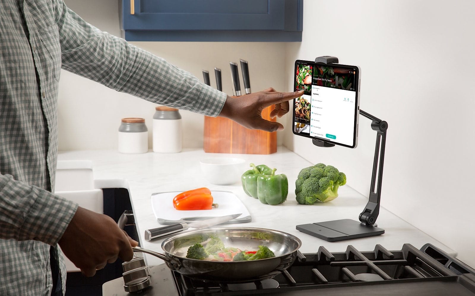 Alternatively, if you’re cooking and don’t want to look too far down at a tablet on the counter, the Hoverbar Duo could lift up at phone or tablet just that little bit more.