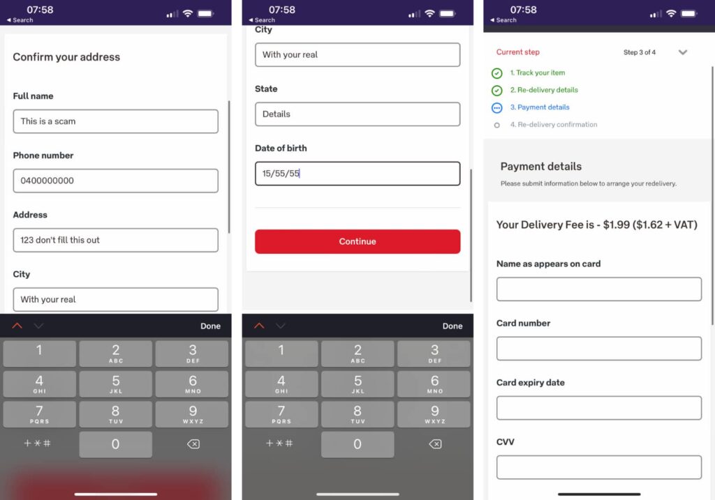 But there are still clear indicators that this Australia Post scam is as bad as the rest. The shoddy work on the cloned website, the different website address, and the fact that Australia Post doesn’t charge for delivery fees when they’re attempting a redelivery.