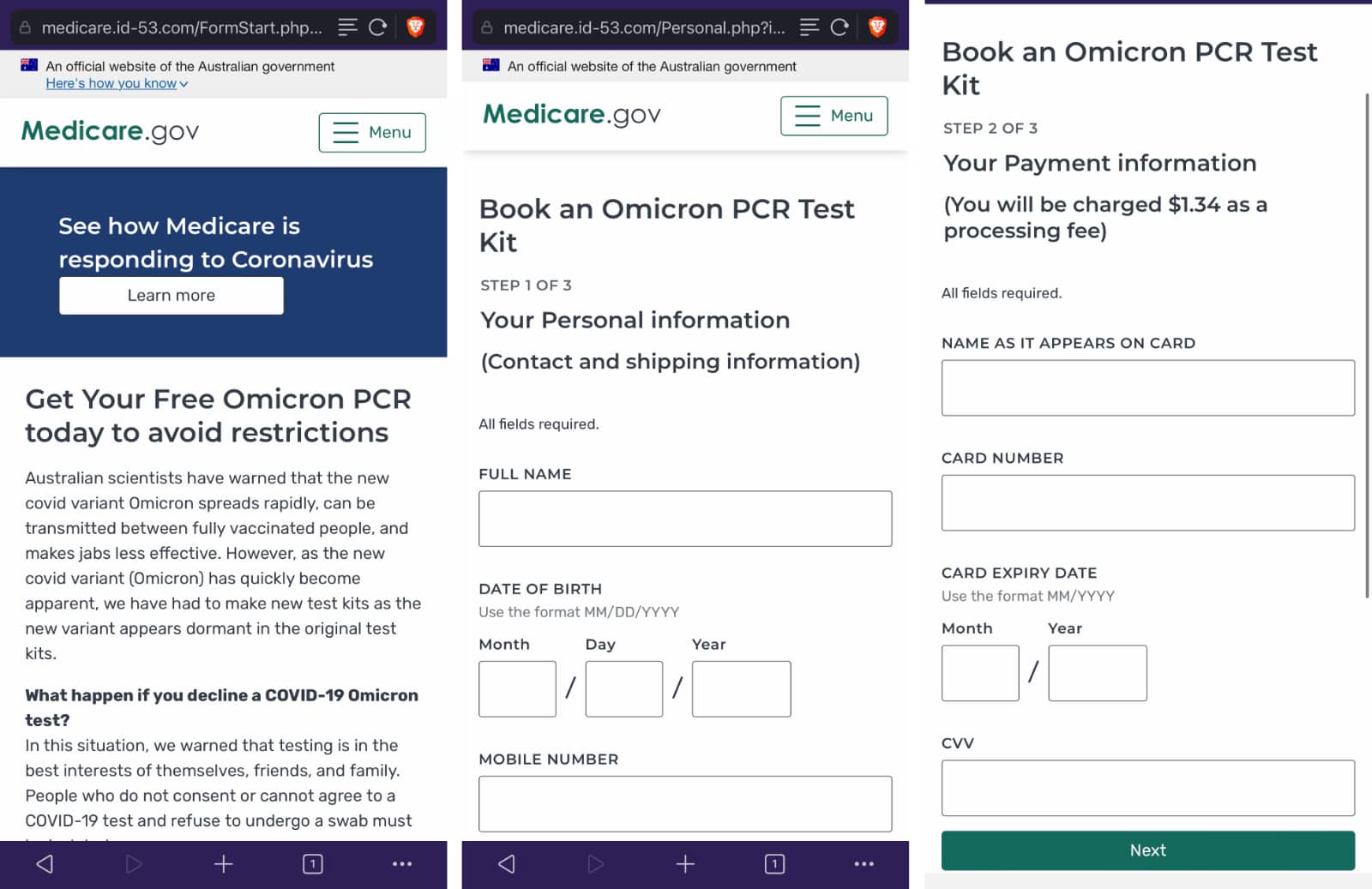 Simply put, scammers want you to fill in the form, and then make your way through to the credit card screen, where they say you’ll be charged a processing fee to get your Omicron test kit.