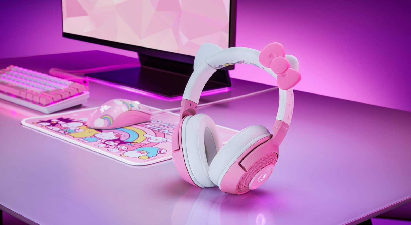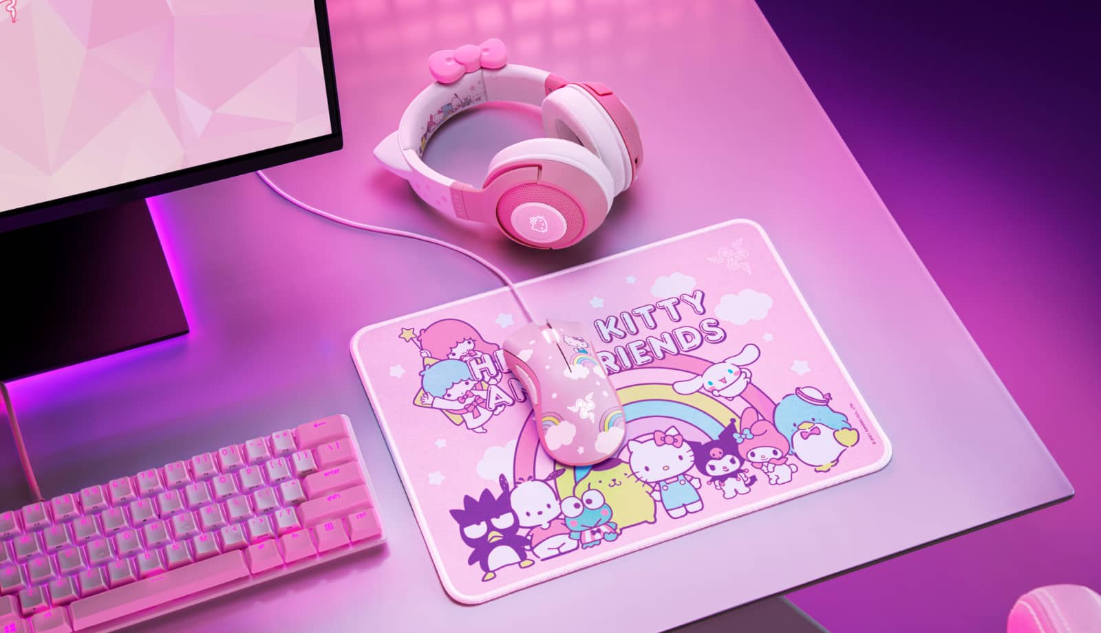Razer’s collaboration is a very bright approach to the normally dark and edgy green gear we see from the gaming brand, with a Hello Kitty DeathAdder Bluetooth mouse, a Hello Kitty Goliathus mouse pad, a Hello Kitty Kraken Bluetooth headset, a Hello Kitty Iskur X gaming chair, and — if you can believe it — a Hello Kitty lumbar cushion.