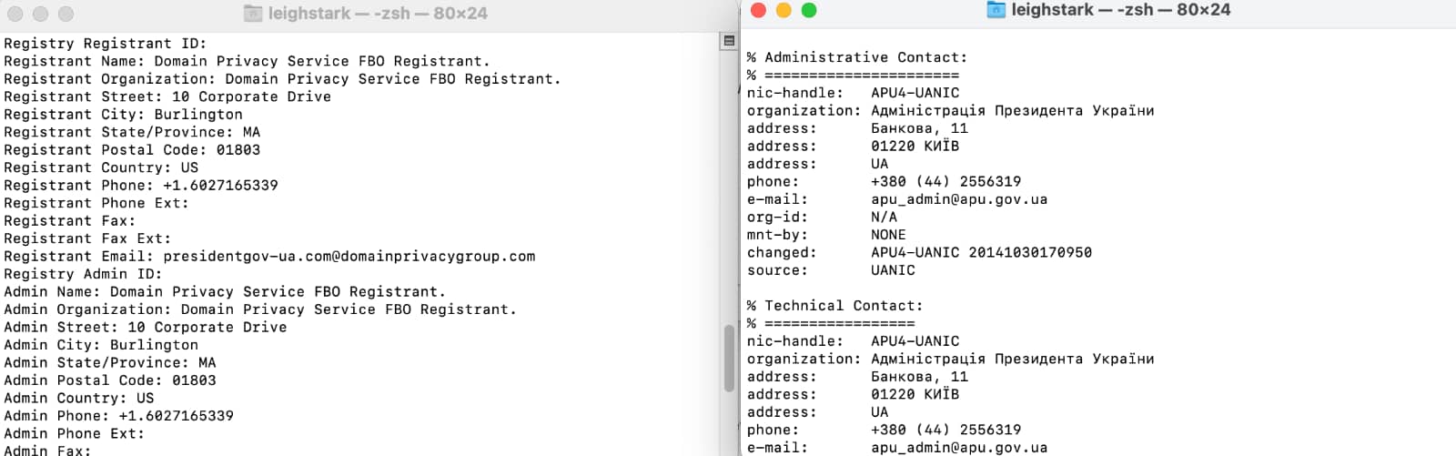 As an example, using a Mac, we can type “whois” into a Terminal window, and find that there’s clearly an administrative and technical contact for the real Ukrainian presidency website, while the scammer is hiding behind a domain privacy setup.