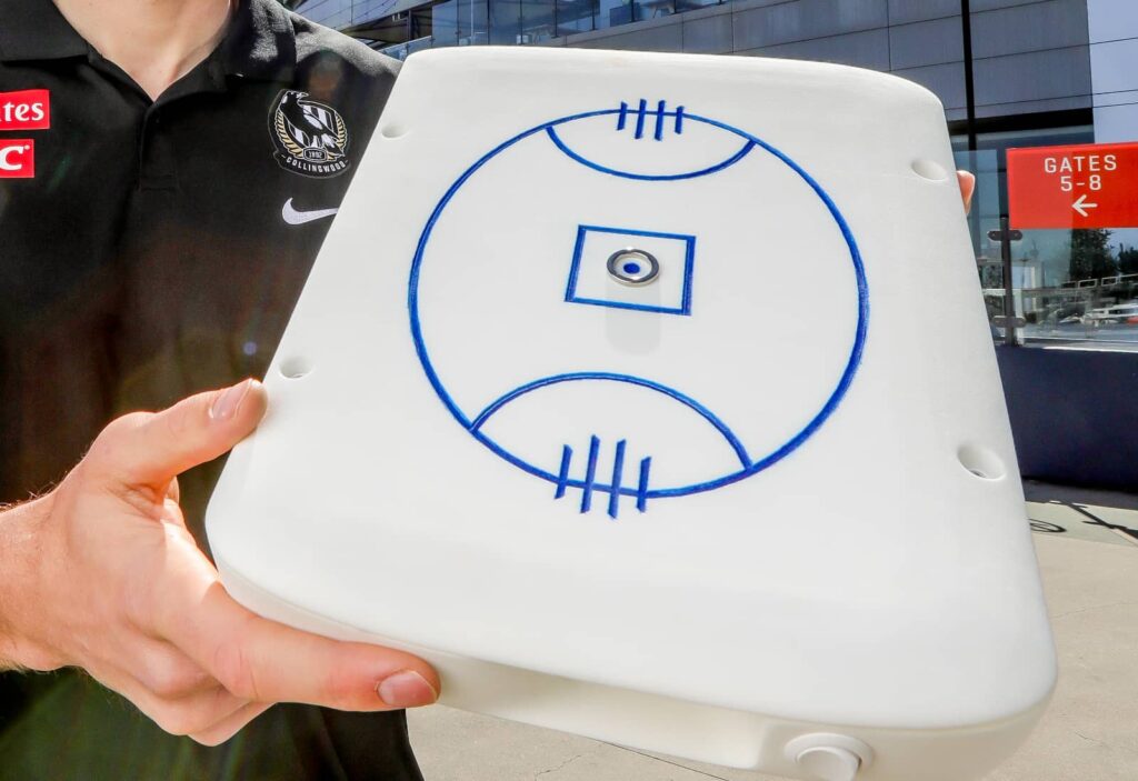 Called the “5G Touch and Track”, it’s a large-ish plastic tablet slate that goes without a screen, replacing the most obvious part of a tablet with a made for purpose etching of an AFL field. On the surface, there are tactile lines made to let you feel the field, and there’s a small magnetic ring on the surface that moves along that virtual field, corresponding to where the ball would be in the game.