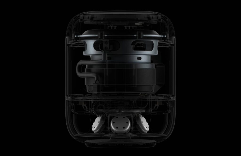 There’s a new chip for processing audio, the Apple S7, the chip used for the Series 7 Apple Watch, and it’ll process the audio for an assortment of five tweeters sitting atop a woofer, a motor that can move the diaphragm, and a build in microphone to handle the bass and equaliser.