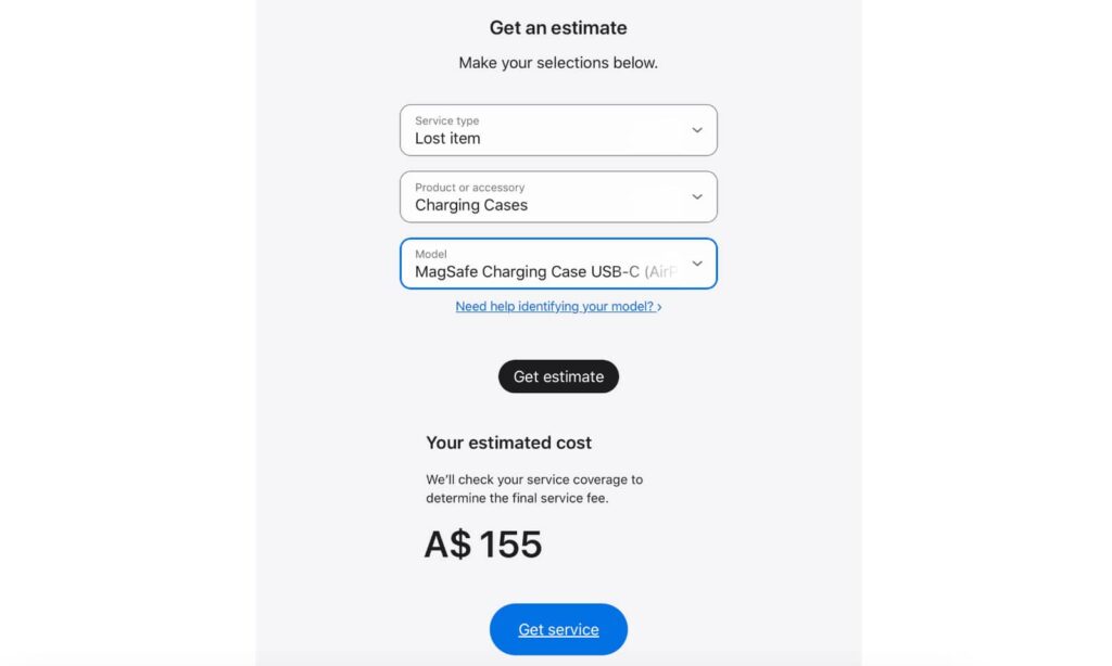 Simply head to the AirPods repair page and select “lost item”, “charging cases”, and then the “USB-C MagSafe Charging Case”, and Apple will provide an estimated cost for the USB C AirPods Pro case. At the time of publishing, that was $155, which is less than half the price of the AirPods Pro 2nd-gen with the case.