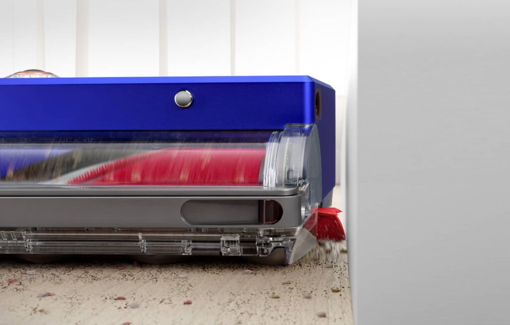 The brush bar is Dyson’s first triple-action approach, including soft fluffy nylon for larger dust and debris on hard floors, anti-static carbon fibre filaments for fine dust on hard floors, and stiff nylon bristles for pick up of elements in soft floors.