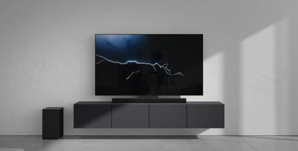 That ease of use continues in the design, with LG’s SC9 soundbar supporting a bracket that allows the soundbar to fit under its LG C series OLED screens, thanks to it being connected to the rear of the screen itself.