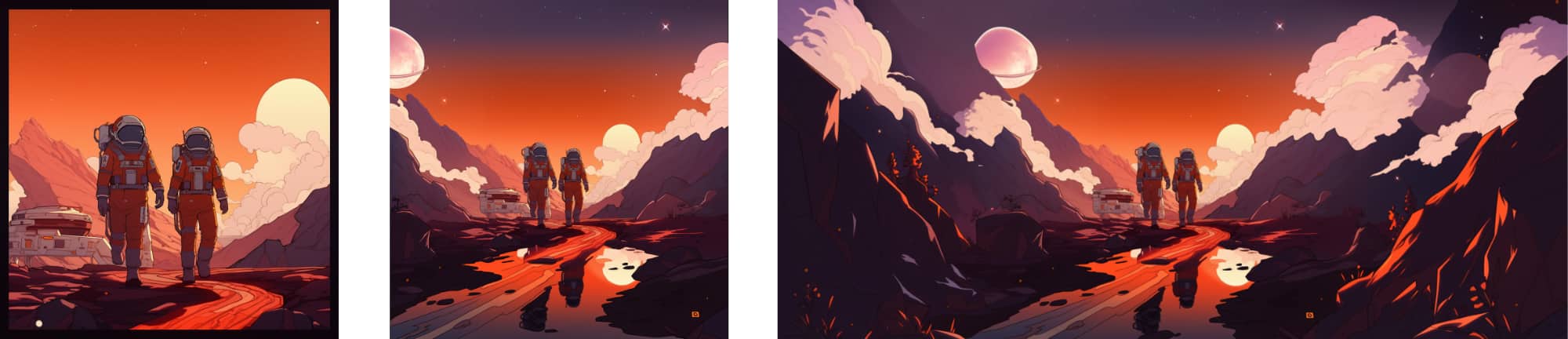 And from there, you simply need to upscale the ones you want and then “zoom out” from each one, as Midjourney comes up with variations on the surrounding imagery that its AI model is processing.
