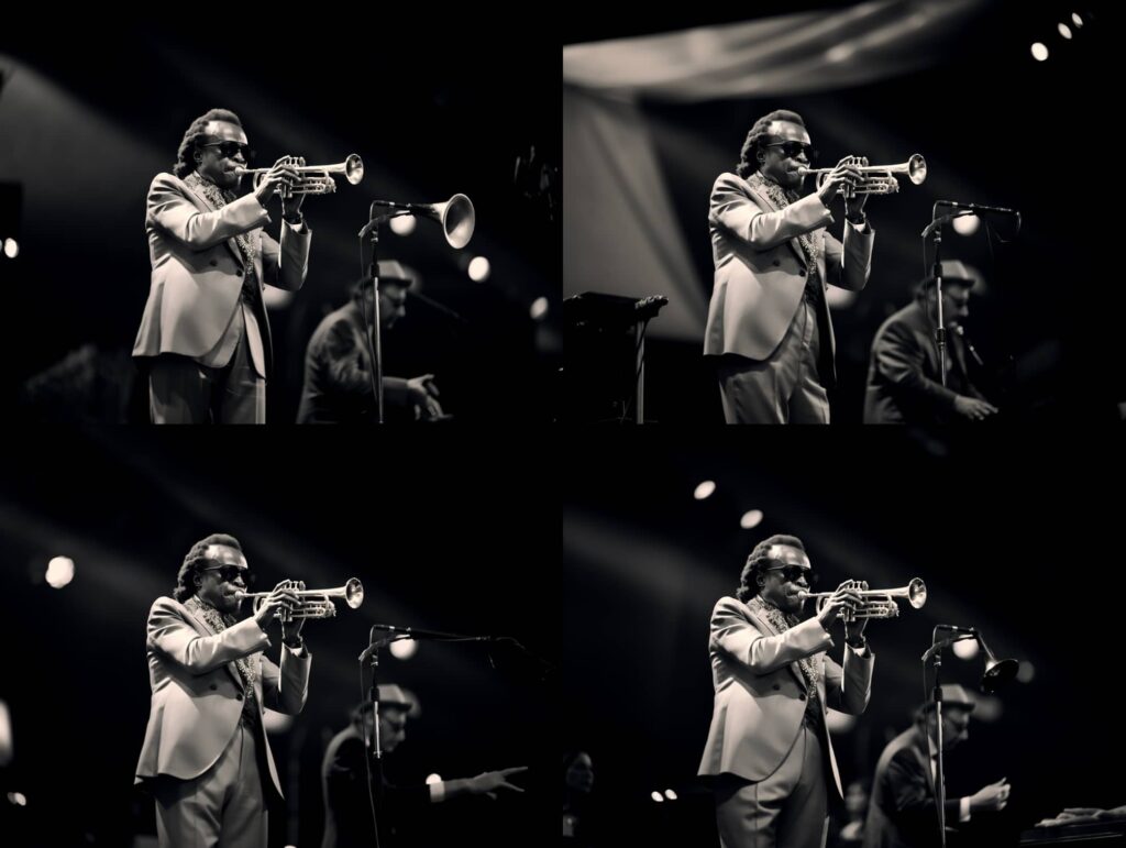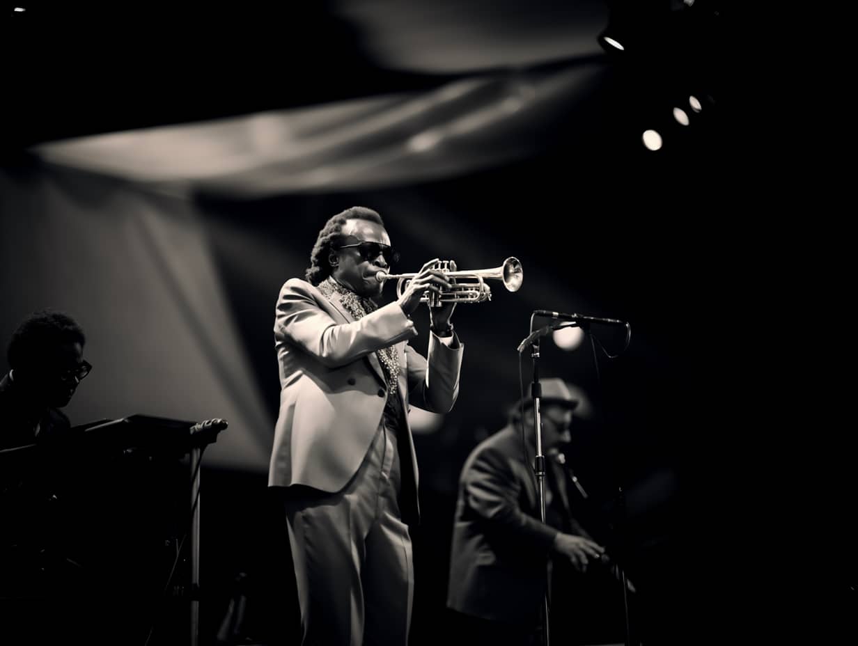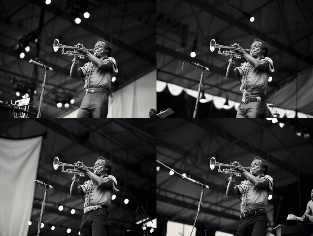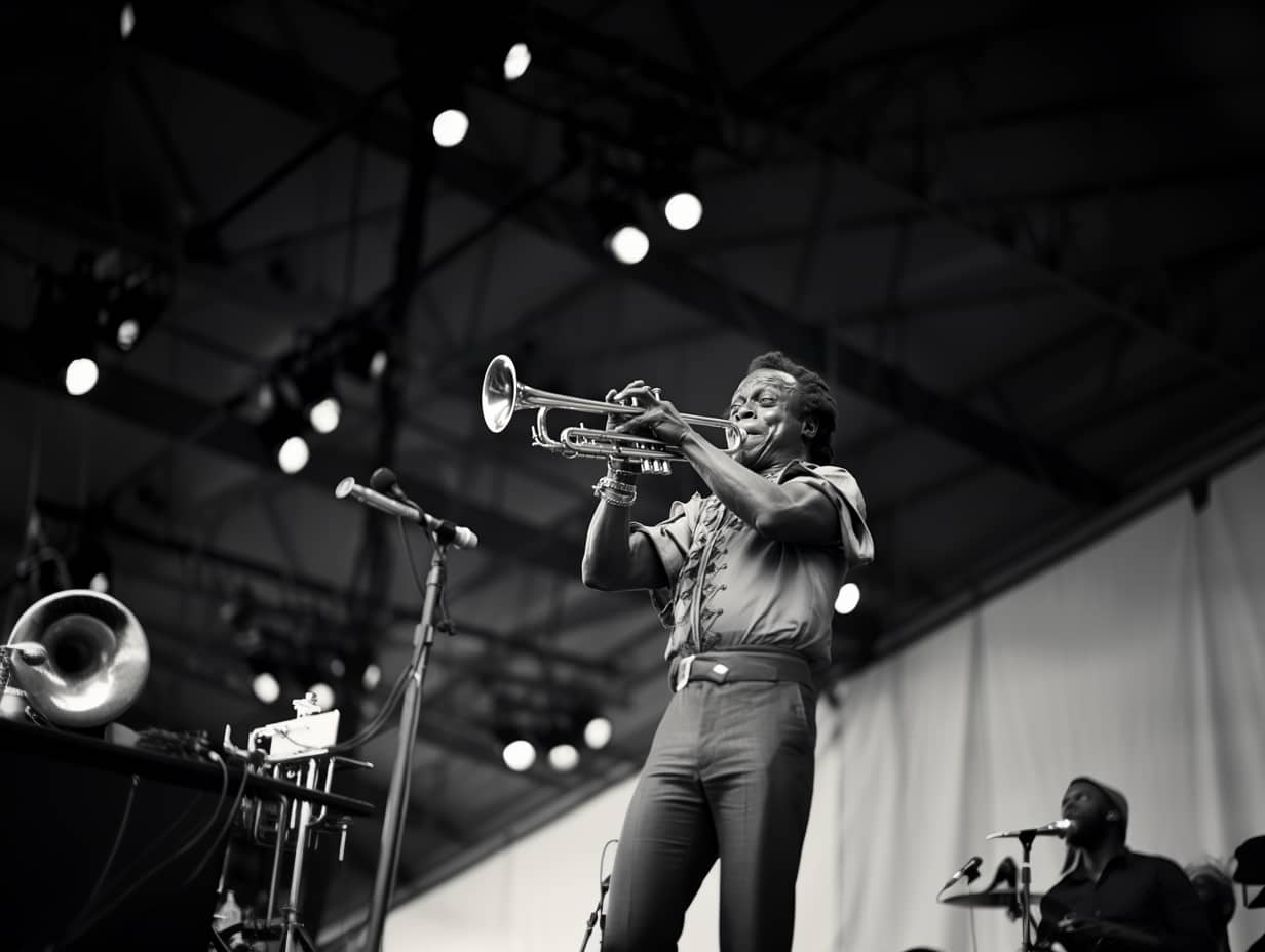 Miles Davis playing trumpet on stage at Jazz Fest, Nikon 85mm f1. 4, black and white, ilford 800