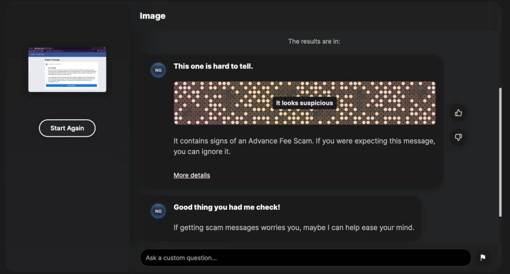 To use it, you simply need to upload a screenshot of what you think is a scam, or alternatively copy and paste the text of a possible scam in. Once either is in place, Norton’s Genie will extract text, scan for links, and use a bit of machine learning to work out whether the message or website is legit.