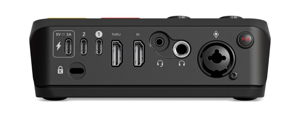 On the back is support for a standard XLR microphone, two headphone jacks over 3.5mm and 1/4 inch, three Type C USB ports (though one is power), plus two HDMI ports covering 4K30 in and 4K60 out, while the top has buttons to control the hardware.