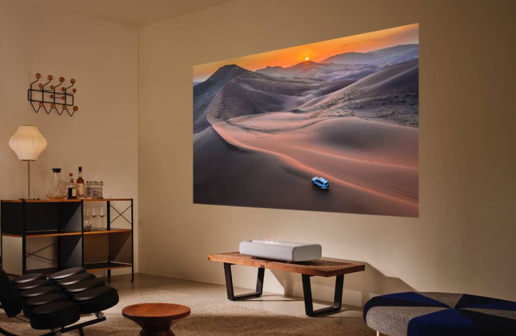 Samsung is updating last year’s “The Freestyle” portable projector, supporting a way of linking up two pieces of content at one time, allowing two devices to project a wider picture on the screen at one time, while Sansung’s ultra-short throw laser projector “The Premiere” will be pushed to an 8K res this year in The Premiere 8K, boasting a maximum screen size of 150 inches, if you need properly big.