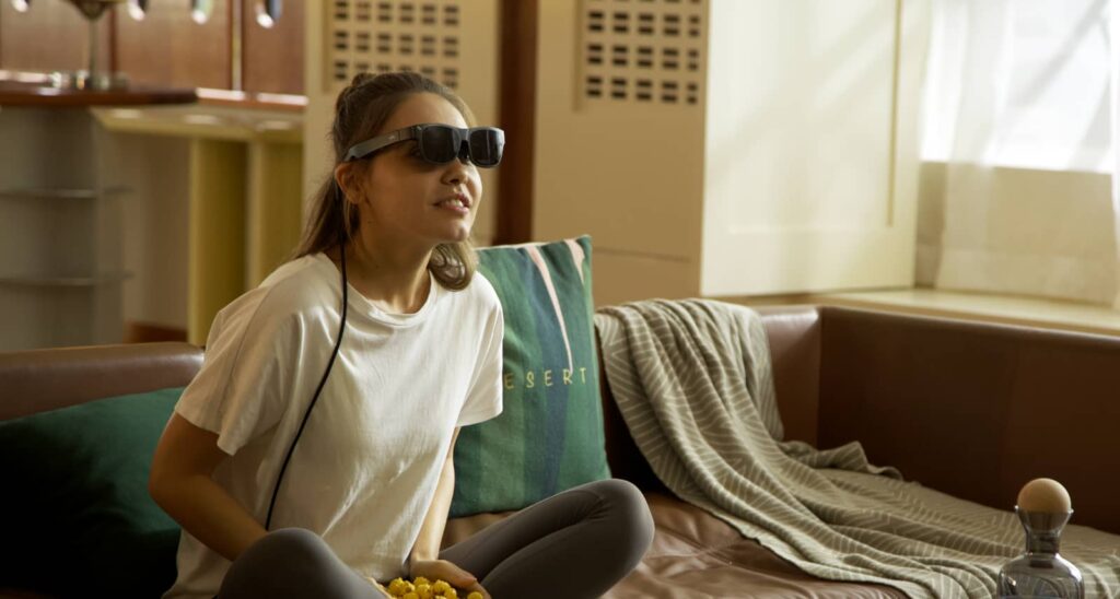 In the TCL Nxtwear S, you’ll need to keep those movies somewhere, like on your phone, which is what this pair of glasses will connect to via a plug, while the glasses themselves are meant to be used anywhere. Weighing 85 grams and using a 30 gram Type C cable, they’re basically a pair of glasses with screens built in, complete with a front lens that can be changed and a back lens that can support detachable magnetic glasses lenses if you have eye issues.