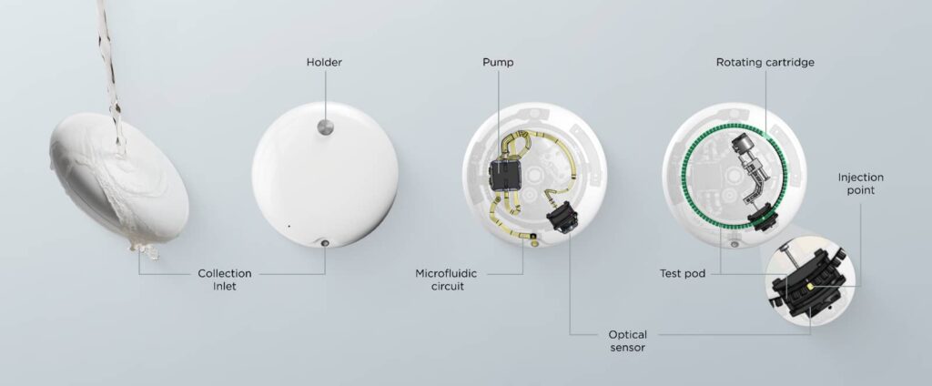 You won’t need to think about how the U-Scan works, but the small white gadget includes a pump that starts working to collect urine when a thermal sensor picks up on you releasing it, which then injects the urine samples into a test pod to analyse its properties, before being expelled through a waste outlet in the device.