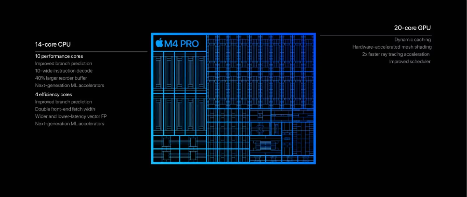 The M4 Pro continues from the base M4, which already us no slouch, boosting the 10-core CPU and 10-core GPU to a maximum of 14 and 20 respectively, delivering speed and graphics render time improvements.