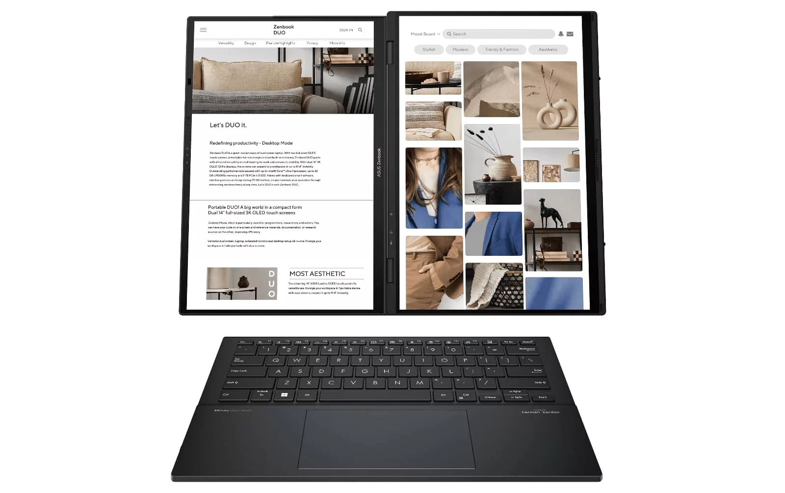 Each screen is a touchscreen, and there’s also an included magnetic rechargeable keyboard, should you wish to use the laptop as a standard laptop, but the 2024 Zenbook Duo can also be used in other ways.