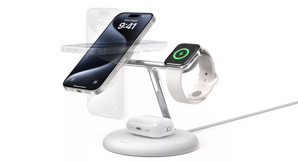 As expected, Belkin has a few ready for release, with the BoostCharge Pro 3-in-1 Magnetic Stand offering a slightly softer take on the 3-in-1 we saw in 2022, supporting Qi2 which is on the iPhone 15 range, plus an adjustable hinge for the phone, so you don’t need to rest the mobile in one specific orientation.