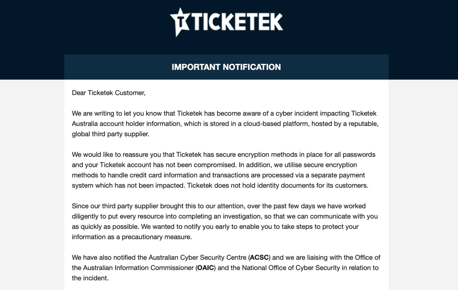We are writing to let you know that Ticketek has become aware of a cyber incident impacting Ticketek Australia account holder information, which is stored in a cloud-based platform, hosted by a reputable, global third party supplier.