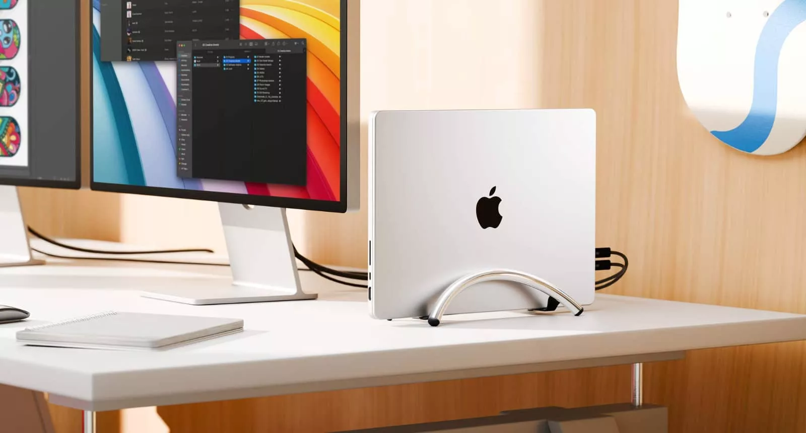 While one option is to use extra furniture to stack up on your desk, such as a set of drawers with a little space for a laptop underneath, another could be to mount the laptop vertically, so that it only holds the rather slim bit of space on its side.